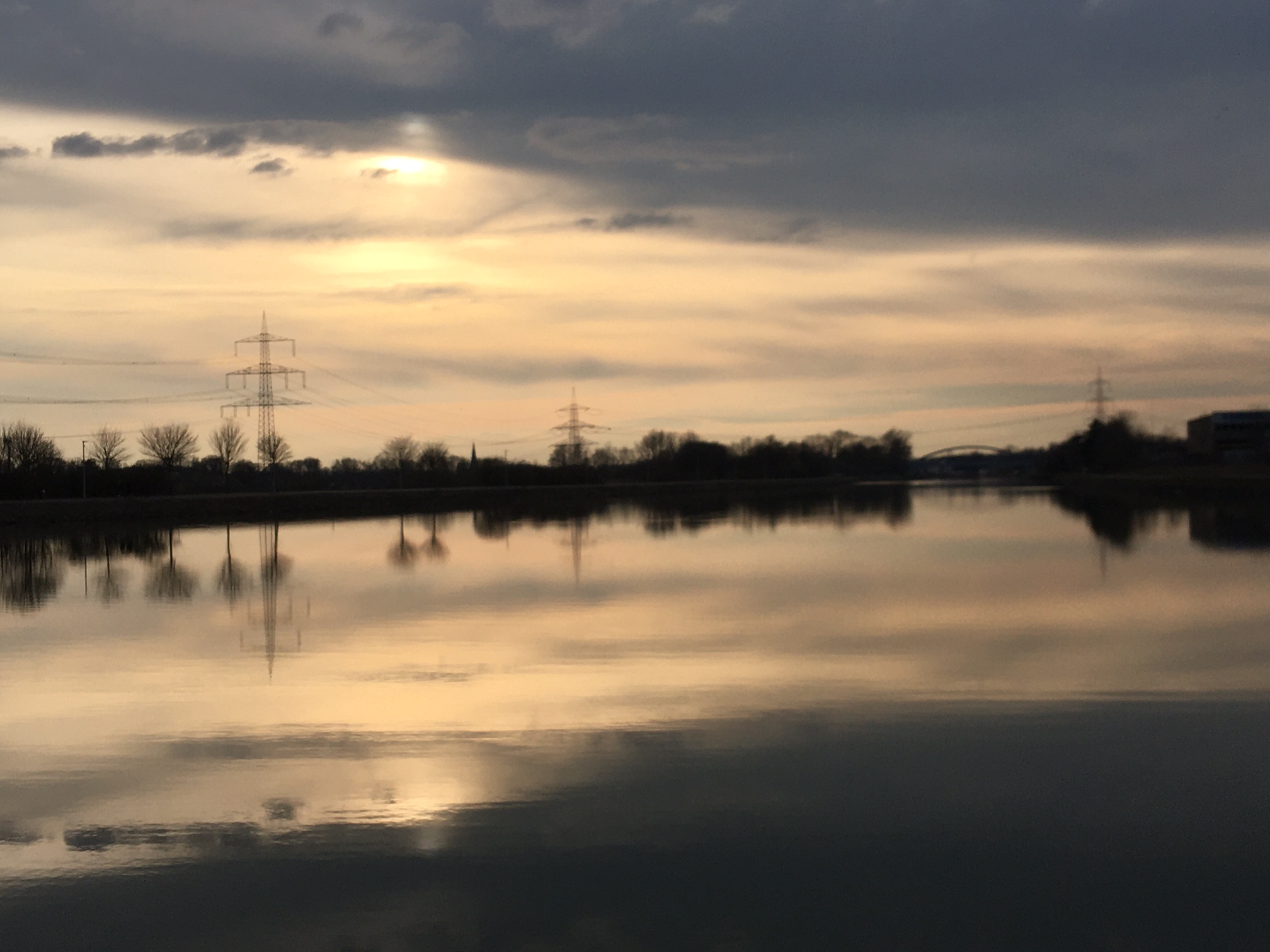 Wir laufen am Kanal entlang und machen eine kleine Pause auf einer Bank direkt an der Spitze der Insel. Auf dem Foto sieht es schon schwer nach Sonnenuntergang aus, das täuscht, die Sonne ist hinter der Wolke und macht ein wunderschönes Licht.
